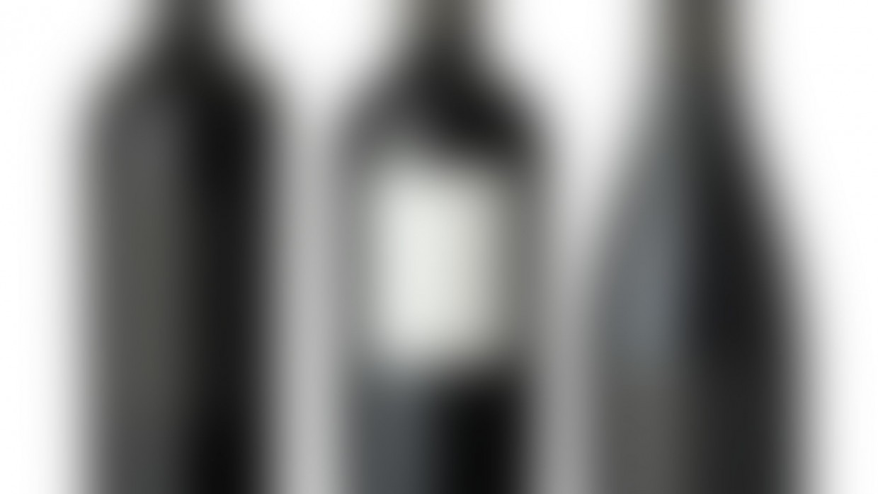Three merged photographs of different shape red wine bottles with blank labels. Separate...